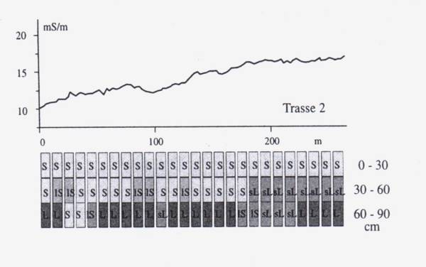 Die folgende Darstellung zeigt den Bodenscanner Messwert in Abhängigkeit der Bodenart in unterschiedlichen Bodentiefen (Quelle: Lück et al.):
