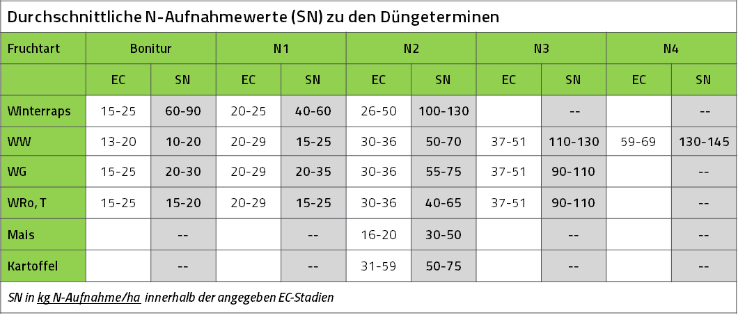N fertilization is implemented with the help of integrated control functions. From certain threshold values (N uptake), the N fertilization in poorly developed stands is reduced. These are dependent on the EC stage.